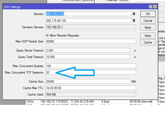 mas um amigo vendo meu sofrimento e agonia pediu para eu colocar os servidores dns. para me ajudar a resolver. entao coloquei conforme fotos abaixo. mas o grande segredo ate entao. ( penso que e pois foi assim que resolveu foi colocar o MAX CORRENT TCP SESSIONS EM 50 ( ate porque so tenho 43 clientes.) nao sei se e realmente isso mas foi isso que resolveu aqui para eu, ja que de mnha meus clientes de 7 megas funcionavam que e ra uma beleza mas no horario de pico.... nossa era a rede toda me ligando reclamando de lentidao.