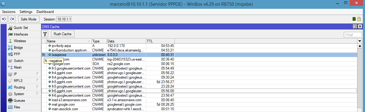 Em minha RB750 ativei o Cache DNS e a pouco tempo percebi que de vez enquanto aparece alguns dns com um N na frente, de negative.