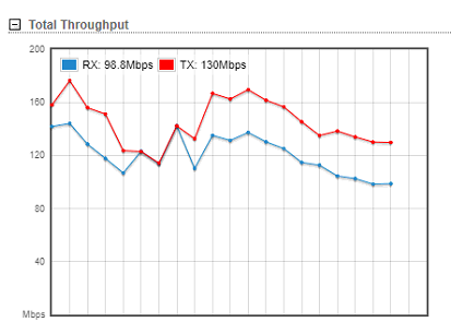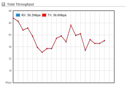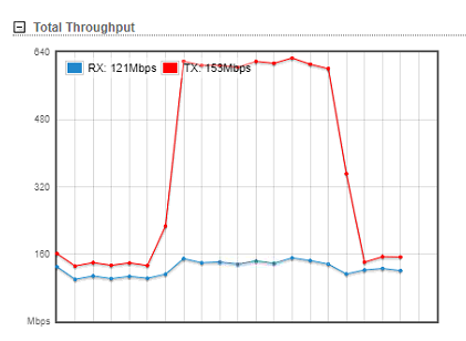 Um dos graficos do Tough, mostra quanta banda esta passando por ele. Esse grafico possui 2 linhas, uma azul e uma vermelha (RX=entrada de link e TX=saída de link), que se você não selecionar nenhuma porta especifica, mostra a soma de todas as portas.