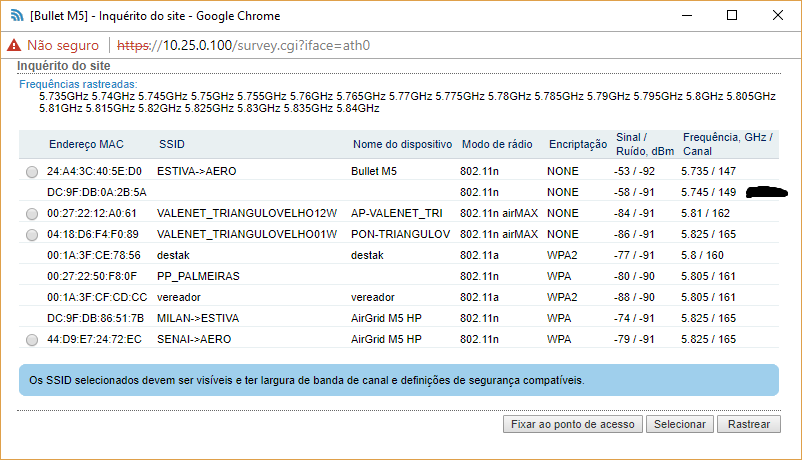 tenho 2 bullets m5, configurei um como ponto de acesso e o outro como estação, ambos em wds. quando mando localizar o ponto de acesso percebo que ele acha o ponto de acesso sem me mostrar o ssid e nem me da a opção de selecionar, quebrando a cabeça aqui percebi que o mac do ap é esse: