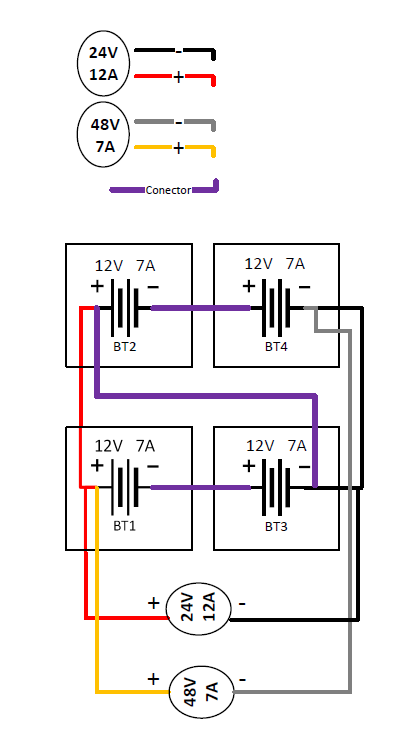 Onde você colocou as saidas de 24v e 48v na verdade se você olhar bem elas são uma coisa só... duas saidas de 24v 14A... a ligação que você fez entre o positivo da bat1 e o negativo da bat 4, na verdade é um curto na saida...