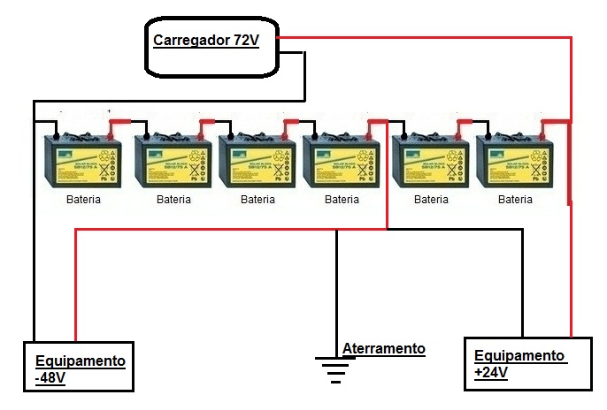 Precisa ficar atento, por que equipamentos em 48Vcc o GND é positivo e os de 12 ou 24 o GND é negativo. Caso o GND sejam isolados, dá para se fazer com um único banco de baterias, do contrário precisa de dois bancos ( 24 e 48). Aconselho a utilizar dois bancos, por que numa eventual substituição de marca ou mesmo modelo você pode precisar refazer toda a sua estrutura.