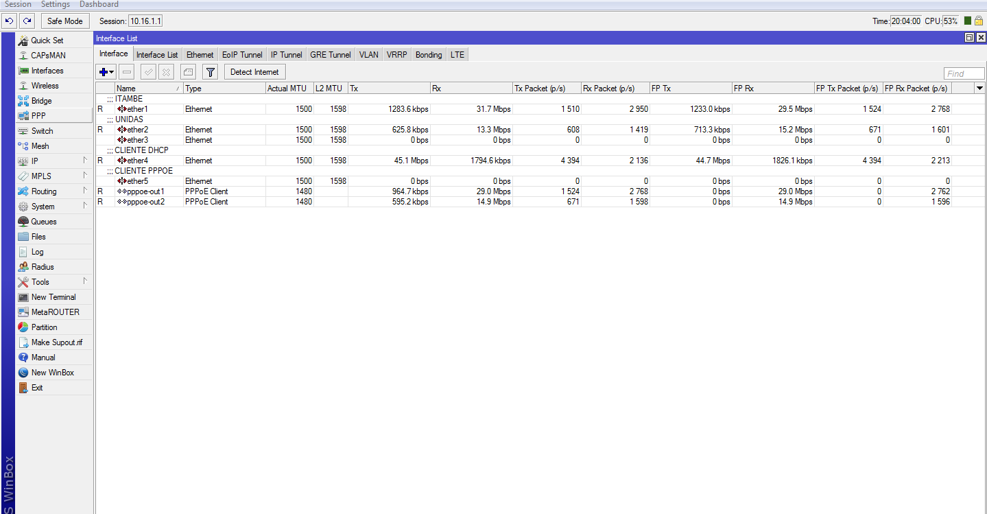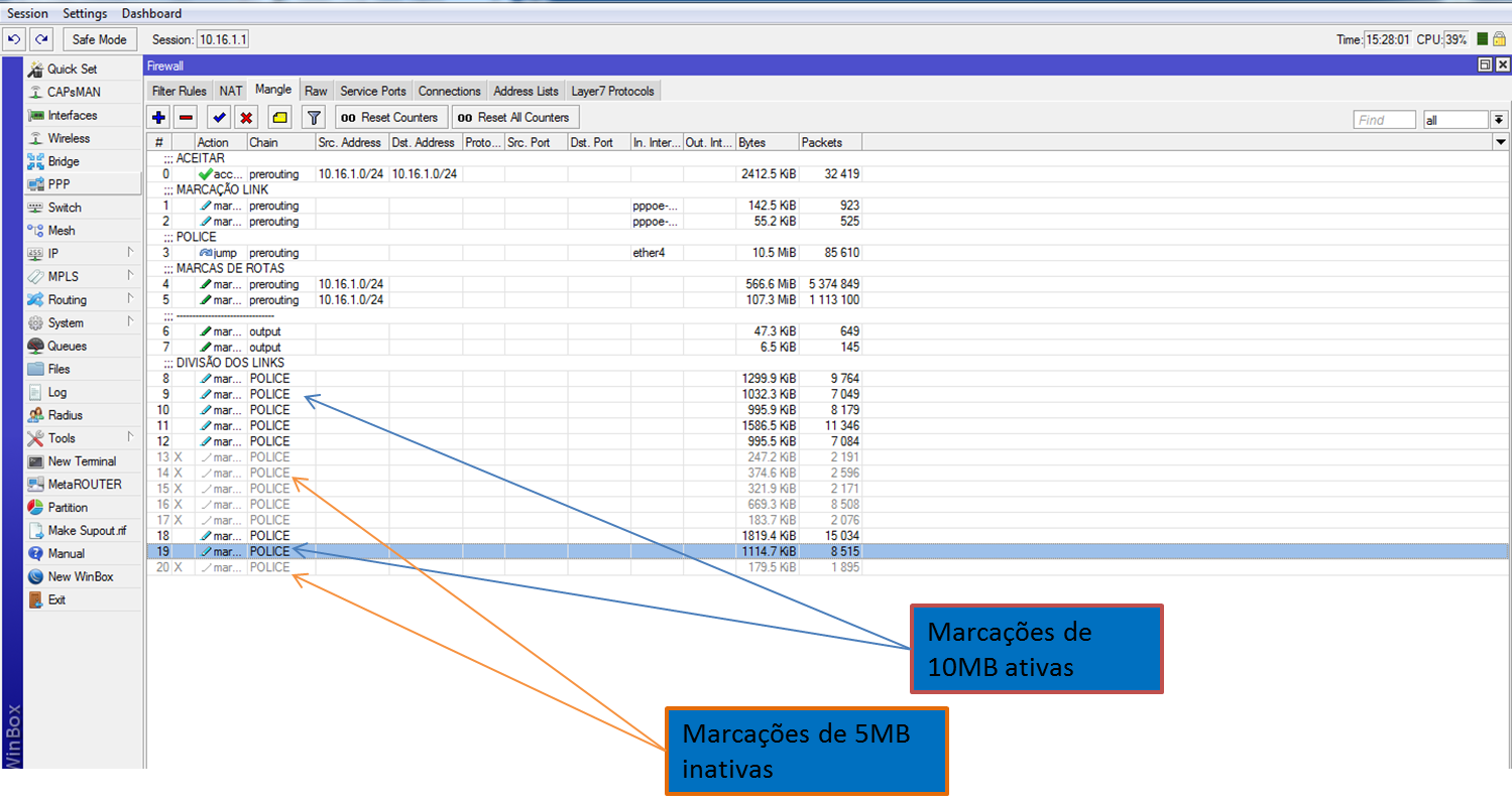 Olá pessoal. Sempre que preciso fazer algum serviço com mikrotik tenho que pagar para quem sabe! Comecei a estudar o mikrotik recentemente e hoje resolvi fazer um balace com 2 links sendo o primeiro link de 50MB e o segundo de 15 MB ( só para fins de estudo). Dividi os links em 13 marcações de 5 MB cada aonde dá = 65MB (50MB +15MB), porém, notei que assim o link de 15MB quase não tinha consumo, ficava em 2, 3 máximo 4MB de consumo. Notei que o mikrotik dividia quase em partes iguais o tráfego e como o primeiro link tinha mais marcações o tráfego nele era muito maior do que no segundo link de 15MB. Tive uma ideia para dividir os meus 65MB, fiz da seguinte forma, as marcações seguinte foram 7/6 ou seja de 10 em 10 megas.