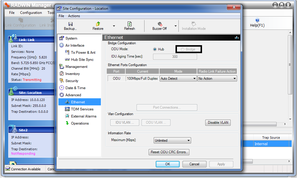 Estou tentando configurar um RADWIN2000 aqui so com a fonte, pois eu não tenho a IDU dele. só que não estou conseguindo habilitar a bridge, e por isso não passa o link.