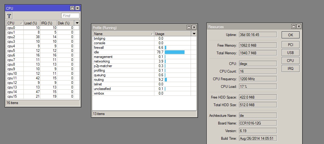 Gente tinha visto muitos relatarem que bgp nestas CCR geralmente um dos nucleos fica quase sempre em 100%, compramos um em uma sociedade, e foi configurado o bgp com duas operadoras nele, uma com 300mb e outra com 200mb, as vezes tenho notado que os pings nao ficam muito bons, e o processamento realmente fica em 100%.