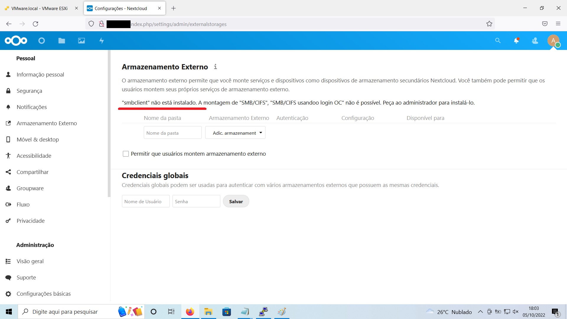alguém aqui sabe como fazer o nextcloud reconhecer smb preciso utilizar isso, já instalei o cliente smb "sudo apt install smbclient" e também "sudo apt install php-smbclient" e não ativa olhei vários tutorial e não achei nada que funcione aqui.