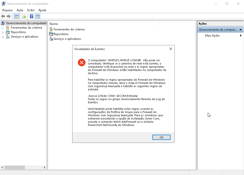 Após realizar o login em um cliente windows c/ administrator, conectar ao servidor de arquivos em Gerenciar Computador pelo RSAT ... apresenta mensagem de erro, uma janela "Visualizador de Eventos" O computador não pode ser conectado. Print está em anexo.