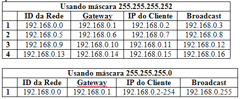 Amigo.. No caso na minha rede eu utilizo máscara 252... Os ips dos clientes andam de 4 em 4... Como ficaria??