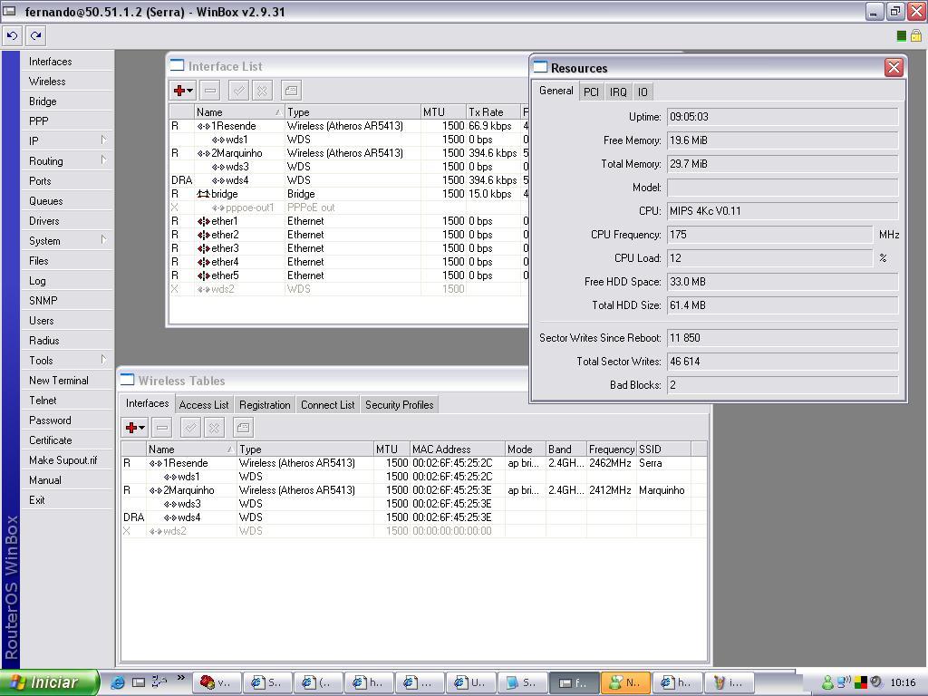 O outro Mare 400 III tem 2 minipci atheros AR5413 (1° fazendo link de 6km, e a 2° fazendo ap para 90 clientes.... os 2 radios estao com mikrotik v2.9.31...