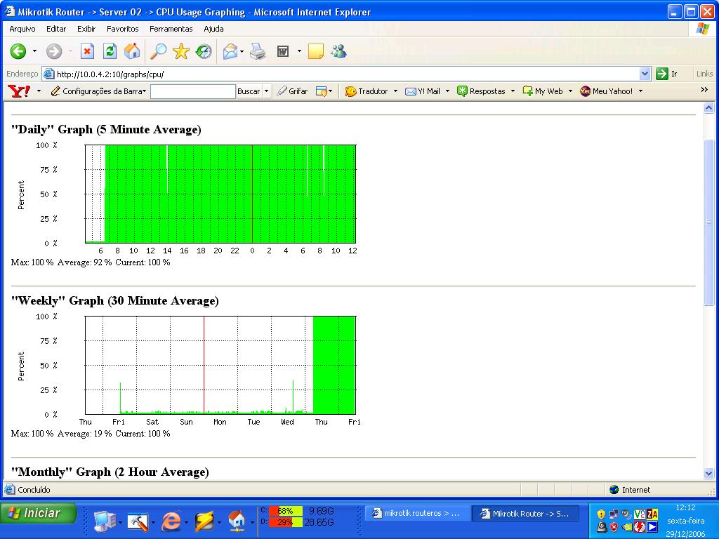 Boa tarde !!! a todos !!! fui olhar o usa da CPU do meu MK e fequei assustado !! com o grafico !! ... ele esta cravado no maximo !!! ... como pode isso !! ???? OBS ... nao foi alterado nada !! no server !! ja a algum tempo !!! .....2 - o server ainda esta funcionando !! normalmente ..... alguem tem alguma dica a respeito disso !!! ??? e oq poderia estar causando ??? no agurado !!