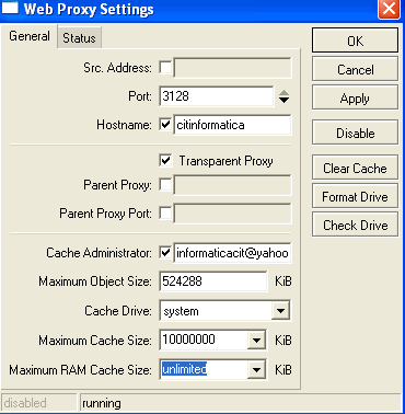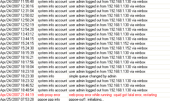 amigos me ajudem, seguem em anexo as fotos do log e das conf do webproxy. ta acontecendo assim, a cada uns dois dias, trava meu servidor, mas ele sempre voltava normal em questao de 3 minutos. mas eu nao sabia o que era, entao coloquei para gerar os logs no disco do mikrotik, acontece que entao ontem ele travou, só funcionava o msn, e deu este erro do squid, acho que entao era este erro que ficava dando só que ontem foi diferente ele nao voltou a funcionar, só percebi hoje de manha isto. entao entrei pelo winbox e mandei reiniciar, dai perdi acesso total mesmo a ele, nem o winbox funcionava mais, mas o ping respondia,