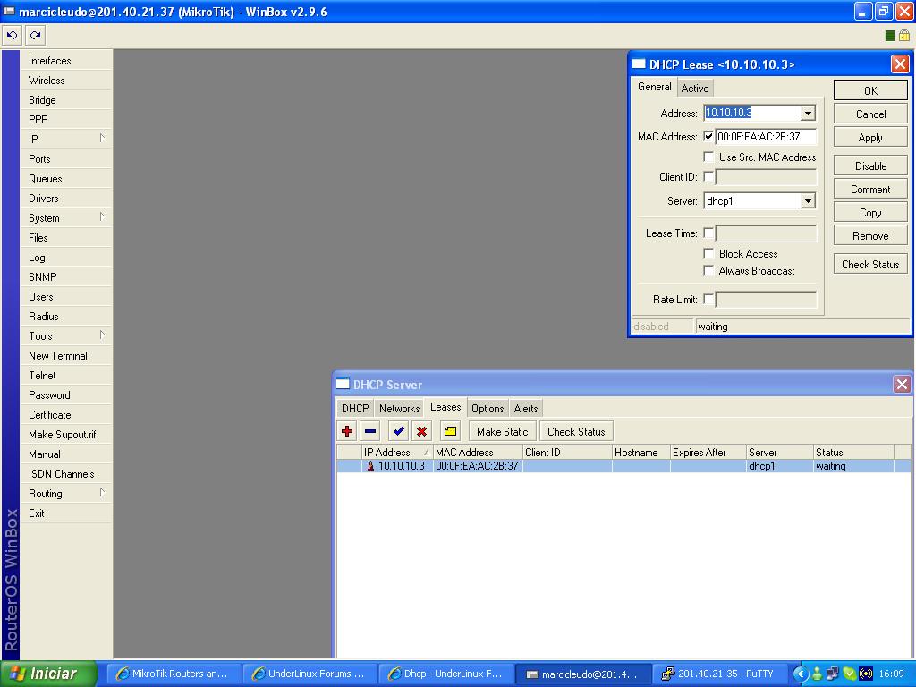 Seguinte: eu estou querendo liberar um endereço de IP pelo DHCP, mas que o endereço de Ip seja liberado sempre o mesmo IP pra o mesmo mac adress. e assim deixando a placa de rede do cliente com as confs automaticas.. assim vai facilitar muito aqui pra nois.
