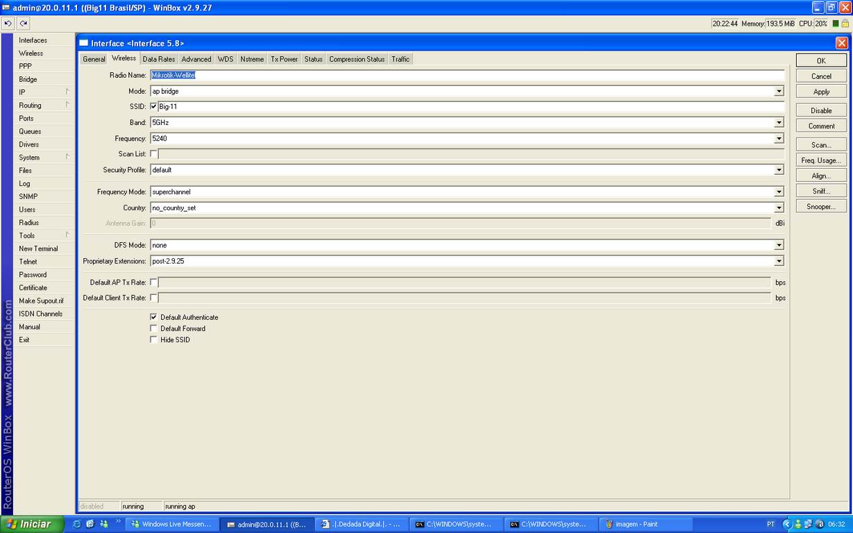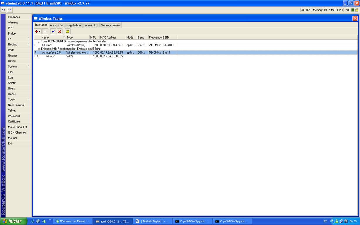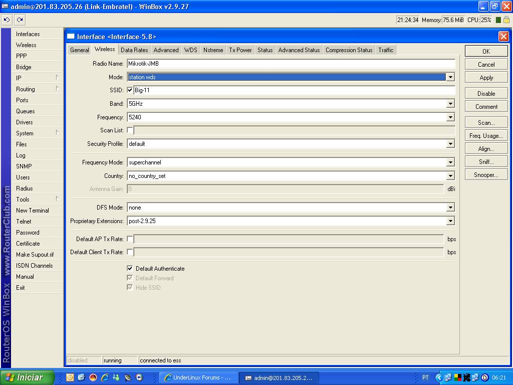 Então se vc tá usando placas dlink ag530 para fazer o wds em 5.8ghz coloca a placa que esta em modo bridge no canal 5240. E nesse primeiro mk vc coloca o mac address do outro mk que esta no modo station wds. quando conectar , vai aparecer RA na interface wds , que vc criou do primeiro MK.