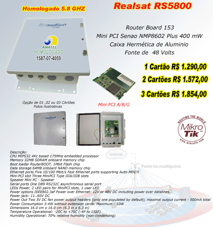 boa noticia, apareseu ap mikrotik homologado, com mini pci e tudo, ou seja, foi homologado equipamento inteiro somente uma coisa me chama atençao, ja vi ese equipamento em tres lojas,e graciosamente esta o mesmo valor, como pode, sera preço combinado, uma espeçie de cartel ?????