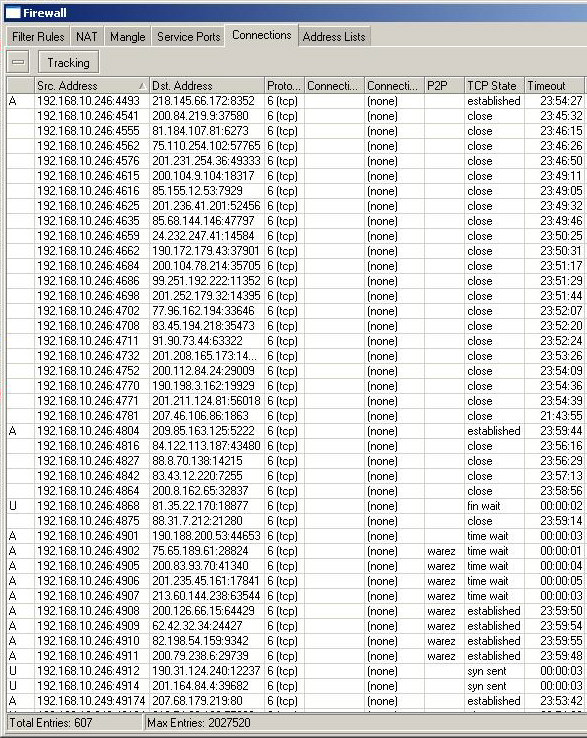verifiquei em ip firewall connections, e estava lá uma infinidade de conexões p2p "warez", vejam no screen em anexo.