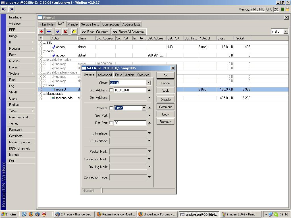 boa tarde a todos, to com o seguinte problema...mas isso não ocorre muitas vezes, de vez em quando não concigo abrir paginas, mas o msn e o skype estão funcionando, ai é só dar um reboot, reiniciar o mk que tudo volta ao normal....porque isso ocorre, e tem como fazer algo pra que não aconteça?