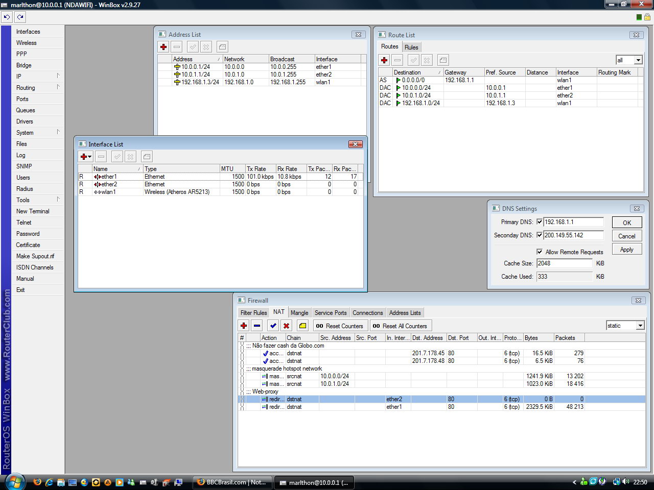 Sobre as regras, não entendo praticamente nada delas, as adsl funcionam perfeitamente, não uso bridge, dois hotspots independentes, Amigo eu já trabalho a um ano com uma OMNI Aquárius de 15DB e por mais que todos aqui digam que ela é ruim, pra mim está funcionando perfeito, agora estou levantando mais uma OMNI de 21DB que por sinal as Duas OMNIs já estão funcionando na mesma torre a uns 2 meses sem problemas nenhum, mas eu tinha apenas uma ADSL, agora preciso por mais link, e eu queria que cada link fosse direcionado para uma OMNI. Muito obrigado a todos que estão me ajudando, queria pedir mais uma coisa, que quando mandarem eu fazer uma regra ou etc, que se possível colocassem a regra aqui pra mim, pois não entendo praticamente nada se regras. Abração.