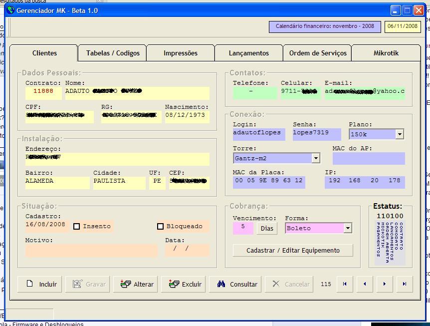 Bom pessoal este projeto foi iniciado no começo do mês passado ja ralei muito tenho um certo conhecimento no mikrotik mas preciso da ajuda de todos para que esse projeto venha a ter conclusão vejo que muitos vem aqui no Underlinux pegam informações e vão comer quietos dentro de quartos e por fim n o posta aqui a n ser uma versão cheia de bugs bom minha proposta para com os senhores é a seguinte sou fã do under a muito tempo ja desde qndo eu ja n sabia de nada sobre linux e mikrotik dai comecei a mecher nesse sistema e foi amor a primeira vista a principio me deparei com algo chato justamente a parte financeira, pois é veio a necessidade de criar um como uso proprio ja q tenho provedor então vamos trabalhar em equipe, tenho conhecimentos em delphi 7 n será mt dificil e se for n será pra sempre pq nada é impossível então esta lançado a proposta me ajudem vamos montar esse prog quem tbm tiver conhecimento nessa área por favor será todos os tipos de comentários menos covardia de quem tem medo que este projeto chegue a tornar-se grande.