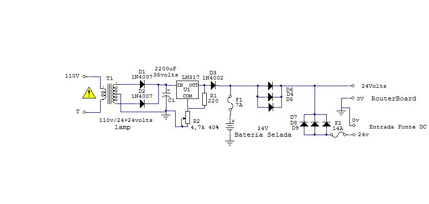 Para uso em baterias seladas, não sei se é o seu caso, a corrente máxima por bateria é 1,75 Amp, e a tensão é 13,8 volts, esses detalhes influênciam na vida útil da bateria e também numa carga perfeita. Cada caso é um caso, eu tive que fazer por que eu não podia usar baterias no pé da torre, por causa de roubo, então tive que subir as baterias, e não rola subir bateria de carro 40 metros na torre, então optei por baterias seladas. Como eu uso uma fonte de 24 volts por 14 amp na torre, para alimentar todas as RB, eu não podia simplismente socar os 14 amp nas baterias seladas, então tive que fazer o carregador. Bateria de Carro é diferente, mais não sei sobre os valores de amperagem e tensão para uma carga perfeita. Um outro detalhe que observei em testes, é que no caso de alimentção por baterias, 24 volts é melhor que os 12 volts, pois quando a bateria começa a enfraquecer e a tensão cair, a RB trava, a tensão mínima é 10 volts, mais com tensões baixas os travamentos são mais constantes, e tão com os 24 volts temos uma tolerancia maior para quedas de tensão quando a bateria enfraquecer.