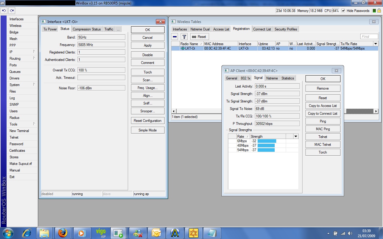 Esse enlace é com RBs série 500 e 433 na outra ponta mas ambas com cartoes R52H-350, Antenas de 29 Hyperlink disco, Cabos RGC213 de 1.5Mts e Fonte de notebook Acer 18V 3.5A. Passo um link de 20MB neste enlace.