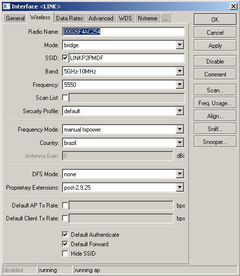 mode=bridge ssid="LINKP2PMDF" area="" frequency-mode=manual-txpower country=brazil antenna-gain=0 frequency=5550 \