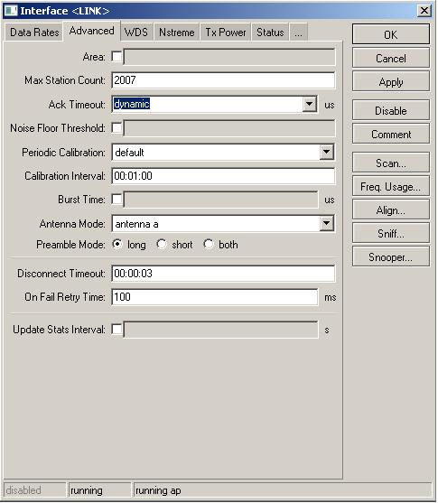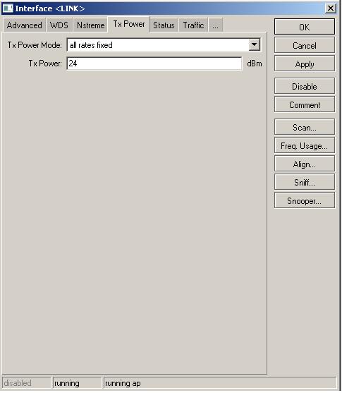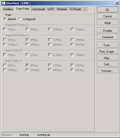 basic-rates-a/g=9Mbps max-station-count=2007 ack-timeout=dynamic tx-power=24 tx-power-mode=all-rates-fixed \
