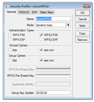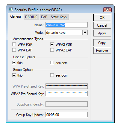WPA2-PSK e tkip e na pre-shared key uma senha de 64 caracteres.