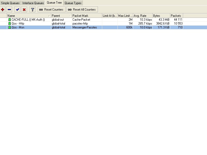 Segue o passo-a-passo detalhado:1º - Marca os pacotes HTTP porta 80: / ip firewall mangle  add chain=prerouting protocol=tcp dst-port=80 action=mark-connection \ new-connection-mark=http_conn passthrough=yes comment="MARCA PACOTES HTTP" \ disabled=no  add chain=prerouting connection-mark=http_conn action=mark-packet \ new-packet-mark=http passthrough=yes comment="" disabled=no 2º - Cria a queue tree com reserva de banda desejada e prioriza em 1 ou 2: / queue tree  add name="HTTP_down" parent=global-in packet-mark=http limit-at=100000 queue=default priority=2 max-limit=256000 \ burst-limit=0 burst-threshold=0 burst-time=0s disabled=no :: QOS MSN ip firewall mangle add chain=prerouting protocol=tcp src-port=1863 action=mark-packet new-packet-mark=msn-out passthrough=yes comment="MSN" \ disabled=no  add chain=prerouting protocol=tcp dst-port=1863 action=mark-packet new-packet-mark=msn-in passthrough=yes comment="" \ disabled=no  add chain=forward protocol=tcp tcp-flags=syn action=change-mss new-mss=1360 comment="" disabled=no  ------------- queues tree add name="msn-in" parent=global-in packet-mark=msn-in limit-at=256000 queue=default priority=1  max -limit=256000 \ burst-limit=0 burst-threshold=0 burst-time=0s disabled=no  add name="msn-out" parent=global-out packet-mark=msn-out limit-at=300000 queue=default priority=1 max-limit=300000 \ burst-limit=0 burst-threshold=0 burst-time=0s disabled=no :: QOS VOIP / ip firewall mangle  new-connection-mark=teste passthrough=yes comment="PORTAS ALTAS - VOIP" \ disabled=no  add chain=prerouting connection-mark=teste action=mark-packet \ new-packet-mark=teste2 passthrough=yes comment="" disabled=no add chain=prerouting protocol=udp src-port=1571 action=mark-connection \ new-connection-mark=voip_out passthrough=yes comment="VOIP-OUT" \ disabled=no  add chain=prerouting connection-mark=voip_out action=mark-packet \ new-packet-mark=VOIP_OUT passthrough=yes comment="" disabled=no  add chain=prerouting protocol=udp src-port=5060 action=mark-connection \ new-connection-mark=voip_in passthrough=yes comment="VOIP-IN" disabled=no  add chain=prerouting connection-mark=voip_in action=mark-packet \ new-packet-mark=VOIP_IN passthrough=yes comment="" disabled=no  add chain=postrouting protocol=udp dst-port=1571 action=mark-connection \ new-connection-mark=voip3 passthrough=yes comment="VOIP \(PORTA EXTERNA DA \ VONO\)" disabled=no  add chain=postrouting connection-mark=voip3 action=mark-packet \ new-packet-mark=voip3 passthrough=yes comment="" disabled=no  add chain=output connection-state=new action=mark-connection \ new-connection-mark=teste passthrough=yes comment="" disabled=no  Ae colocas estas no queue tree: / queue tree  add name="voip_in" parent=global-in packet-mark=VOIP_IN limit-at=200000 \ queue=default priority=1  max -limit=200000 burst-limit=0 burst-threshold=0 \ burst-time=0s disabled=no  add name="voip_out" parent=global-out packet-mark=VOIP_OUT limit-at=128000 \ queue=default priority=1 max-limit=128000 burst-limit=0 burst-threshold=0 \ burst-time=0s disabled=no  add name="voip_in2" parent=global-out packet-mark=VOIP_IN limit-at=200000 \ queue=default priority=1 max-limit=200000 burst-limit=0 burst-threshold=0 \ burst-time=0s disabled=no  add name="voip_out2" parent=global-in packet-mark=VOIP_OUT limit-at=128000 \ queue=default priority=1 max-limit=128000 burst-limit=0 burst-threshold=0 \ burst-time=0s disabled=no  add name="queue1" parent=global-in packet-mark=teste2 limit-at=200000 \