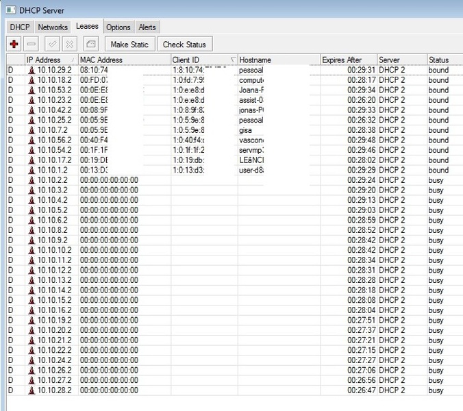 Os clientes só conseguem pegar tudo certinho quando apago os leases. Outra coisa que notei, tem clientes que assim que chegam nos leases rapidinho o mac fica 00:00:00:00:00:00 e com busy no status. Alguem tem uma ideia do que seja?