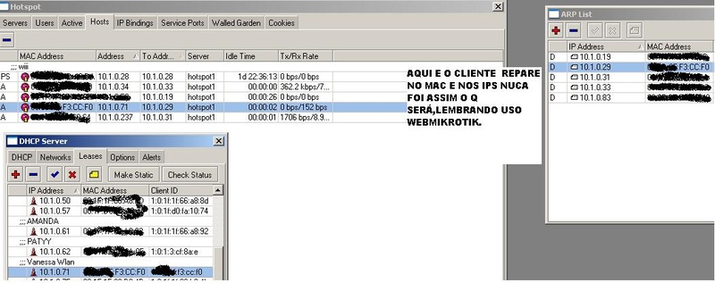 bom no web mk tem uma opção chamada faicha de ip´s, eu tambem to apanhando com isso os ip´s no dhcp são um e no hotspot outra, cada cliente fica com dois ip´s e não to conseguindo resolver tambem ..