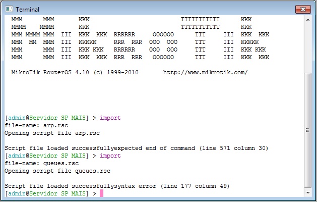 Galera estou tentando importar minha lista de clientes do queuesimple e arp mas não estou conseguindo, alguem pode me ajudar...... de onde exportei a versão é 2.9.51 e estou tentando fazer import para a versão 4.10, os arquivos .rsc já estão no files mas da um erro.....vejam.
