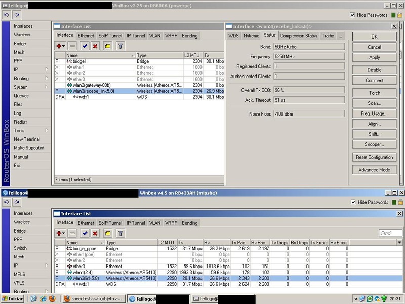 Para fechar o enlace, deixei tx power com 19dbm + data rates fixado em 48 e 54mbps..modo 5.8turbo.