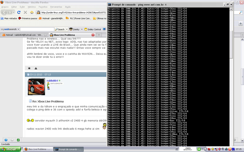 Se for VELOX ou NET, aviso logo: ADSL nao tao adaptadas para o LIVE, pois o mesmo e no EUA!!! So se voce tiver usando a LIVE do Brasil... Que ainda nem sei se ta funcionando!!! Era para ser lançada mes passado mais nao escutei mais nada!!! Entao voce sempre vai ter LAG, pois os servidores sao no EUA!!!