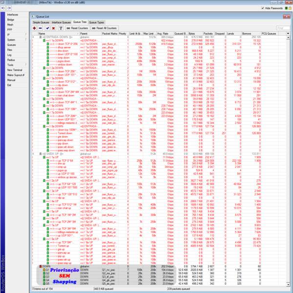 Eu postei meu Queue Tree inteiro, porque além de vir aqui botar defeito, gostaria de opiniões sobre meu atual sistema de priorização ( Meu cenário é um ADSL 5M/512k em um condomínio, via Wireless )