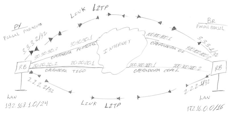 Estou com a seguinte situação na empresa onde trabalho, a mesma tem filiais no Brasil e no Paraguay, para criar um canal de trafego de dados entre essas filiais utilizamos VPN L2TP com (routerboard RB 933 AH) mikrotik em ambas as pontas, até momento tudo funciona normalmente.