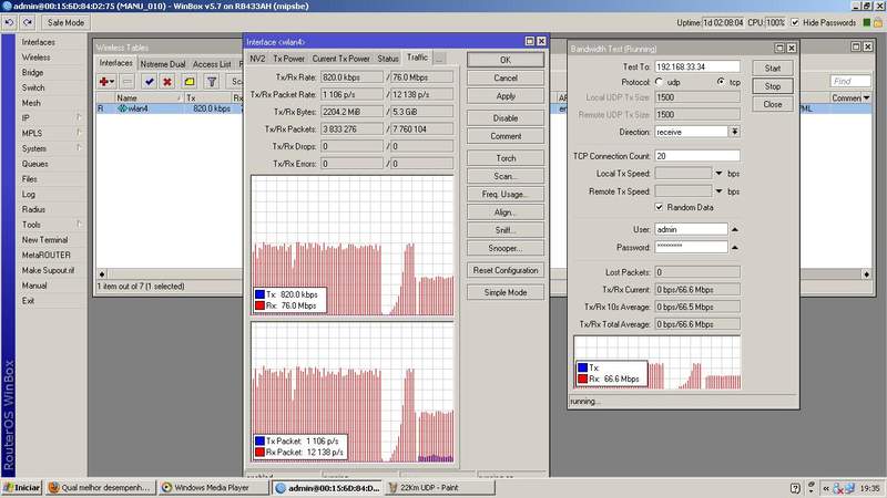 Amigos, gostaria de saber qual melhor desempenho conseguiram com RB 433AH+cartão SR71-15 com antenas de 34 DBI Ubiquiti em 42 km com visada, quantos MB FULL, estou na duvida de usa RB+Cartão ou Rocket m5.