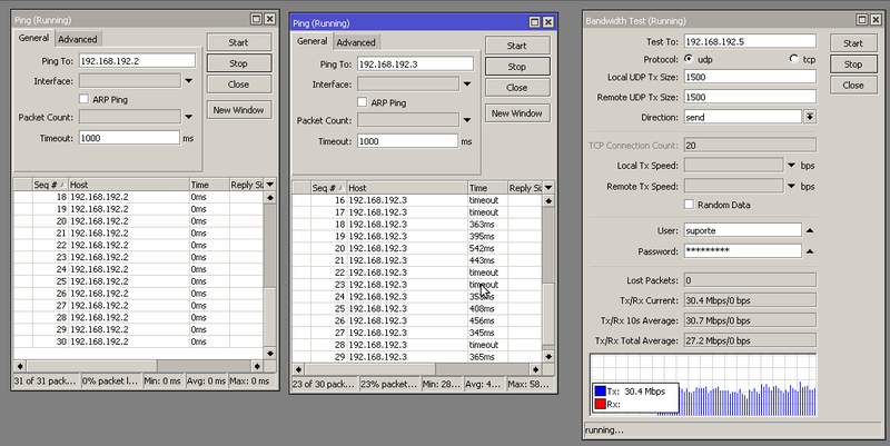 Eu acreditava que consiguiria fechar o enlace em 40Mhz (para maior Troughout), mas piora de uma maneira incrível (ping alto, CCQ abaixo de 20%). Já reconfirmei alinhamento, a bolha de nível esta correta em ambas as antenas, troquei varios canais, com e sem ACK no PTP, ou seja, já revirei ele algumas vezes e não consegui fazer o que pretendia.