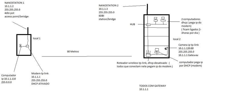 Referente a questão do HUB, a N2 esta em cima de um prédio de 4 andares, dela desce um cabo de rede até o terceiro andar e ligado num HUB, desse hub sai 3 cabos, 1 para o roteador wireless no térreo ( onde esta a câmera ) e 2 para o mesmo andar ( ligado em 2 computadores para compartilhar internet )