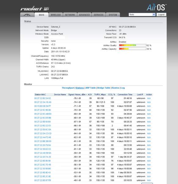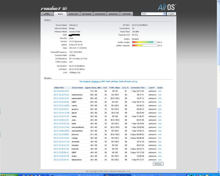 Bom dia a todos, bom estou usando rocketm5 com basestations ja faz 1 ano, agora esse mes. Estou com 12 setorias e tudo legal sem problemas. Tem um bairro que o speedy nao funciona bem, entao é a setorial que estou com mais clientes, que é essa que mandei o print, tem 23 simultaneo e uns 50 total nela.