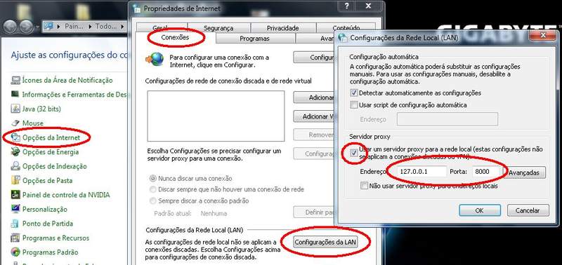 Marque a caixa "Usar servidor proxy para a rede local" e adicione o ip 127.0.0.1 porta 8000.