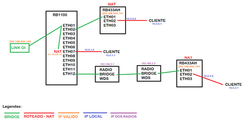 Como perceberam, tenho dois rádios fazendo o WDS do meu link em Bridge. Esses rádios cujo o ip coloquei na imagem na faixa 192.168.2.X coloquei apenas por questão de intendimento, na verdade é outro IP, assim como os demais.