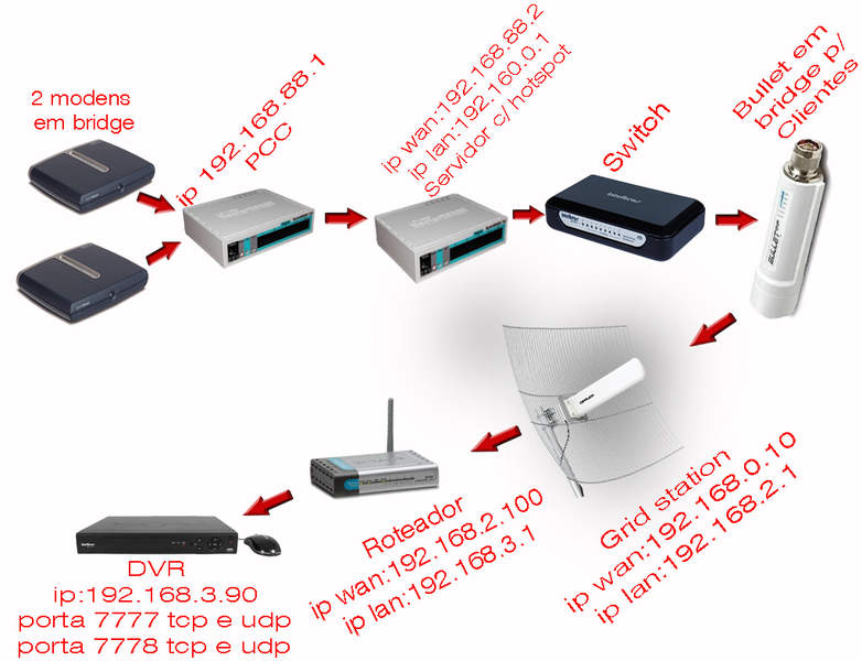 dvr>>ap router(bridg)>>nano m5(fiz direcionamento das portas )>>painel e ponto a ponto (tudo em bridg)>>servidor (direcionei as portas)>>balance mk(direcionei as portas)>>modem em bridg com ip fixo!!
