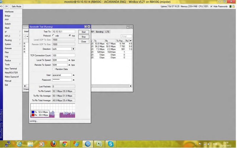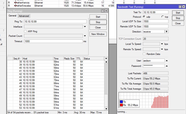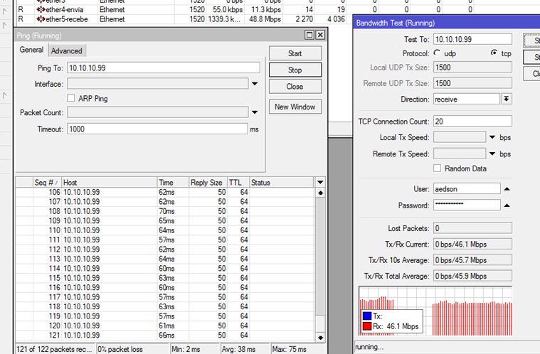 PS: Teste feito como podem ver em TCP, 100 conexões simultâneas, teste em both e regulei TX e RX em 50M cada lado...