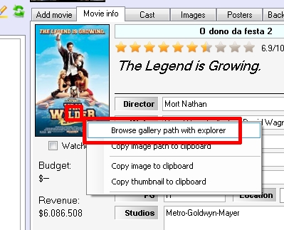 • Quando clicar no filme aparecerá detalhe sobre o filme, clique com o botão direito do mouse e depois "Browse Gallery path with explorer" a pasta irá abrir e irá mostrar a foto da capa do filme em tamanho pequeno e grande.