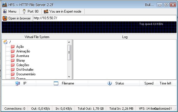 Esta é a interface do programa HFS ele é completo e foi o melhor programa que serviu sem problemas na exibição de filmes na rede.