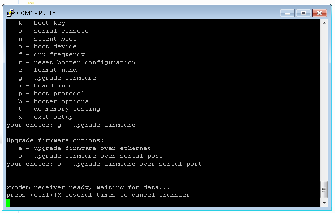 depois apertei "s" e ficou esperando enviar o firmware pelo cabo serial, alguem tem o comando para eu poder enviar o firmware pelo cabo serial?
