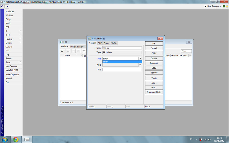 Estou querendo configurar minhas RBs com 3G, mas não estou conseguindo, quando entro na RB 751G-2HnD e na RB 433UAH, na opção system -> ports. As portas USBs não aprecem lá. Com isso, quando vou criar a conexão 3G, criando um PPP Client no lugar da porta aparece como desconhecido.