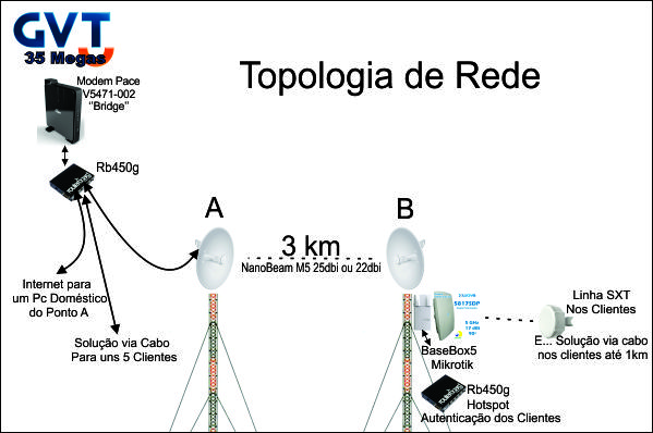 Venho a pouco mais de um mês lendo diariamente o Under baixando tutoriais e estudando, mas é a primeira vez que posto algo, pessoal, como muitos estou apenas começando pretendo um dia ser um provedor SCM mas por enquanto irei de VDSL 35Mb 3,5 Upload minha dúvida é, no ponto "A" do meu ponto a ponto posso atender alguns clientes via cabo ou isso prejudicaria a célula a ser enviada para o ponto "B"? De acordo com a imagem que tentarei postar a disposição dos equipamentos está correta ou vocês mudariam algo? Pretendo usar hotspot na Rb do ponto "B" neste caso como eu poderia gerenciar aqueles poucos clientes do ponto "A"? Teria também que criar um hotspot na Rb do ponto "A"? Enfim considerem que sei quase nada mas estou estudando muito... Minha meta seria 50 clientes com 1 e 2Mb se o link não aguentar posso aumentar a velocidade do mesmo com outro plano de 35Mb fazendo um load balance. Desculpem as várias perguntas forte abraço.