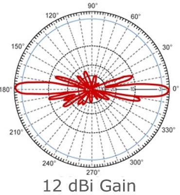 Essa informação que o angulo vertical é mais aberto em antena de 12dBi não procede, alguém entendeu errado a explicação. SE analizar a antena X de 12dBi com a antena Y de 15dBi talvez a informação bata, mas não dá pra generalizar, isso não se aplica a todas as antenas. O que ocorre GERALMENTE (I.E., na maioria das antenas, não tem todas, não generalize) é bem o contrário da figura, antena de ganho maior tem angulo menor, se somar maior ganho e menor angulo o alcance é maior. Angulo maior na vertical só ajuda a permitir conexão mais proxima perto da torre sem depender de lobulo secundário ou reflexo. Mas a diferença entre antenas de 12 e 15dBi vai ser geralmente uma com angulo de 6°, e outra com angulo de 5°. Aqui uma antena de 6dB com angulo vertical grande: