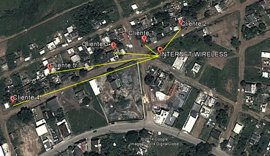 Cliente 4 está a mais ou menos 203 metros de distância sem visada com muitas árvores e um muro alto na frente (ver primeira foto).